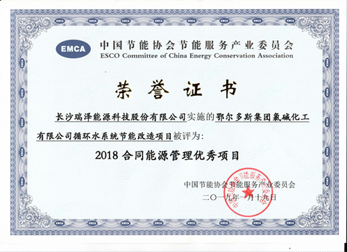 瑞澤能源能源在2018年節能服務(wù)行業(yè)的出色表現再度榮獲“2018節能服務(wù)產(chǎn)業(yè)重合同守信用企業(yè)”、“2018EMCA優(yōu)秀會(huì )員單位”,瑞澤實(shí)施改造的“鄂爾多斯集團氯堿化工有限公司循環(huán)水系統節能改造”項目獲“2018合同能源管理優(yōu)秀項目”獎。