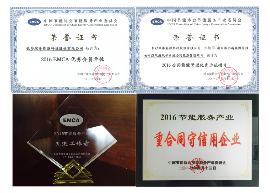 會(huì )上,瑞澤能源榮獲“2016年節能服務(wù)產(chǎn)業(yè)重合同守信用企業(yè)”“EMCA優(yōu)秀會(huì )員單位”和“2016合同能源管理優(yōu)秀示范項目”獎項,公司總經(jīng)理榮獲“2016年節能服務(wù)產(chǎn)業(yè)先進(jìn)工作者稱(chēng)號”。
