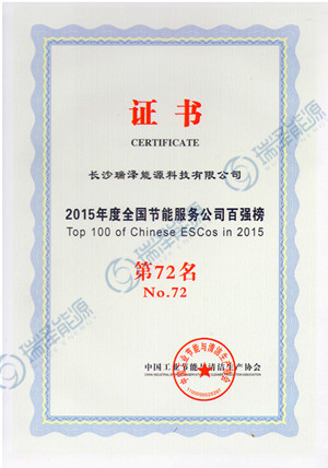 在近日舉辦的“中國節能服務(wù)產(chǎn)業(yè)發(fā)展論壇暨2015中國節能服務(wù)公司百強榜發(fā)布會(huì )”上,中國工業(yè)節能與清潔生產(chǎn)協(xié)會(huì )發(fā)布了2015年度中國節能服務(wù)公司百強榜榜單及研究報告。長(cháng)沙瑞澤能源科技有限公司榮登百強榜單。