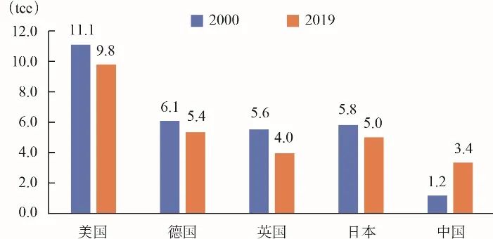 圖2 2000年與2019年中國和典型發(fā)達國家人均能源消費量